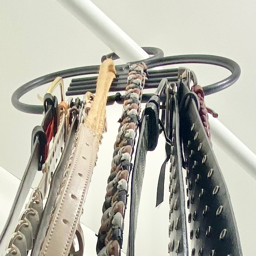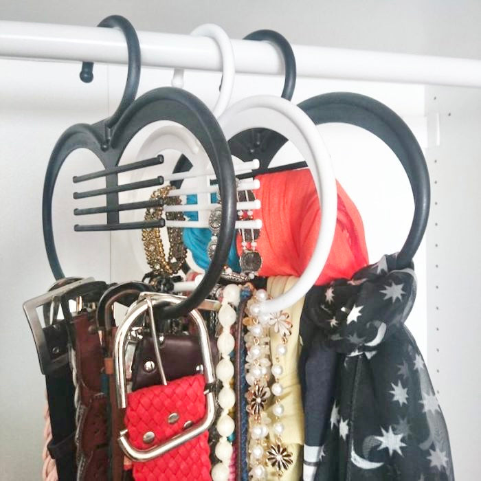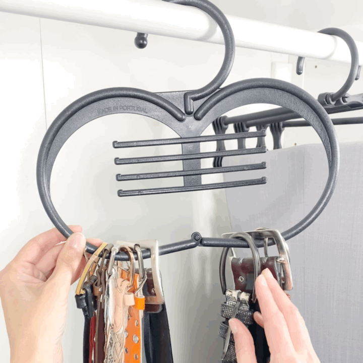 A grande vantagem deste cabide é ter uma abertura no centro que permite tirar o cinto, colar ou lenço sem ter de tirar todos. Basta afastar os restantes para os lados e tirar só o desejado! 😍